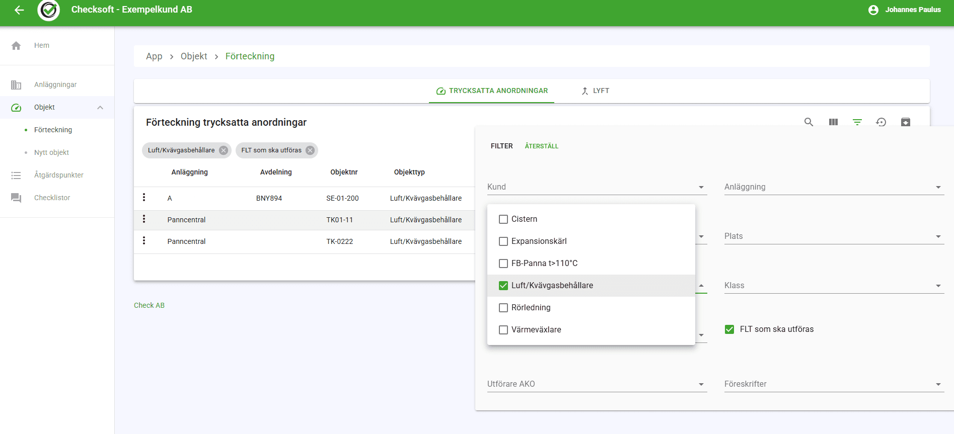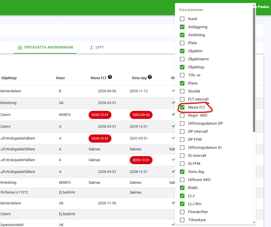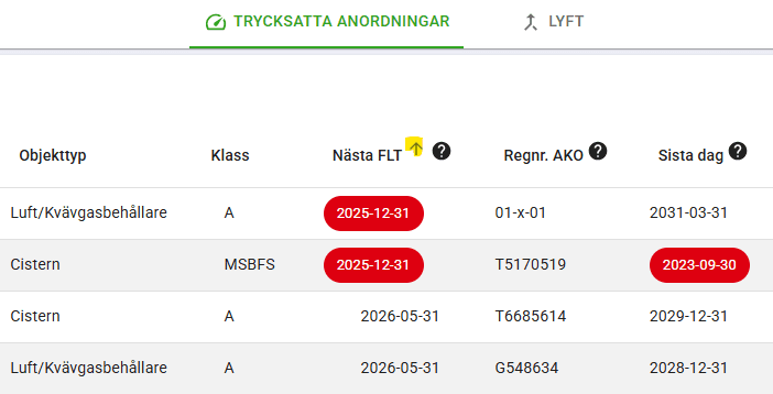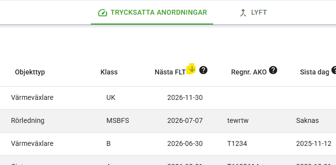 Ett extra tips till dig som utför fortlöpande tillsyn (FLT) är knappen "FLT som ska utföras" - som filtrerar förteckningen på endast de objekt som ska göra FLT på. I samband med att du utför FLT så försvinner de objekten automatiskt från filtret.